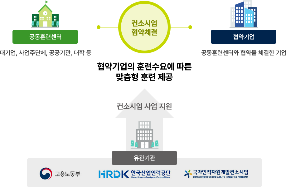 산업전환 공동훈련센터는 급격한 산업구조 변화와 기술 패러다임 전환에 대응하여, 기업의 사업전환과 재직근로자의 직무전환을 동시에 지원하는 국가 주도 직업능력개발 훈련 플랫폼입니다. 기업·사업주단체·대학 등이 공동훈련센터로 지정되어 협약기업과 컨소시엄을 구성하고, 보유한 훈련시설과 교육 인프라를 활용해 현장 중심·수요 기반 맞춤형 직무훈련을 제공합니다. 특히 산업전환 공동훈련센터는 단기 교육 제공을 넘어, 산업 수요 분석–훈련과정 설계–교육 운영–성과 확산까지 연계하는 체계적인 산업전환 지원 모델을 지향합니다.